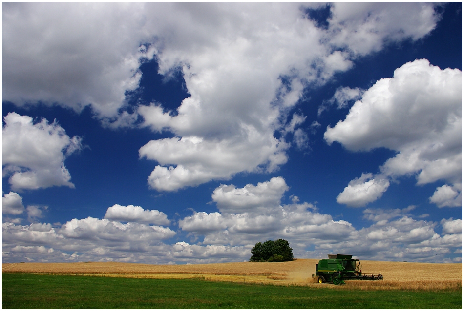 Ein großartiges Bild, in dem alle Grundbedürfnisse von uns Menschen enthalten sind. Die Wolken für ausreichen Regen, die Grünflächen für ausreichen Sauerstoff, der Mähdrescher, der die Ernte für viele Menschen einbringt, und vieles mehr...Deine Bildgestaltung ist ebenfalls besonders gut.